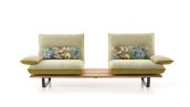 Das Sofa-Programm, das alle Blicke auf sich zieht. Einzelsitze in Spitzkissenoptik, die seitlich bewegbar und um 360° drehbar sind, ruhen auf einem massiven Holzplateau. MANSON differenziert sich mit einer feinen und handwerklich aufwendig gearbeiteten Naht.