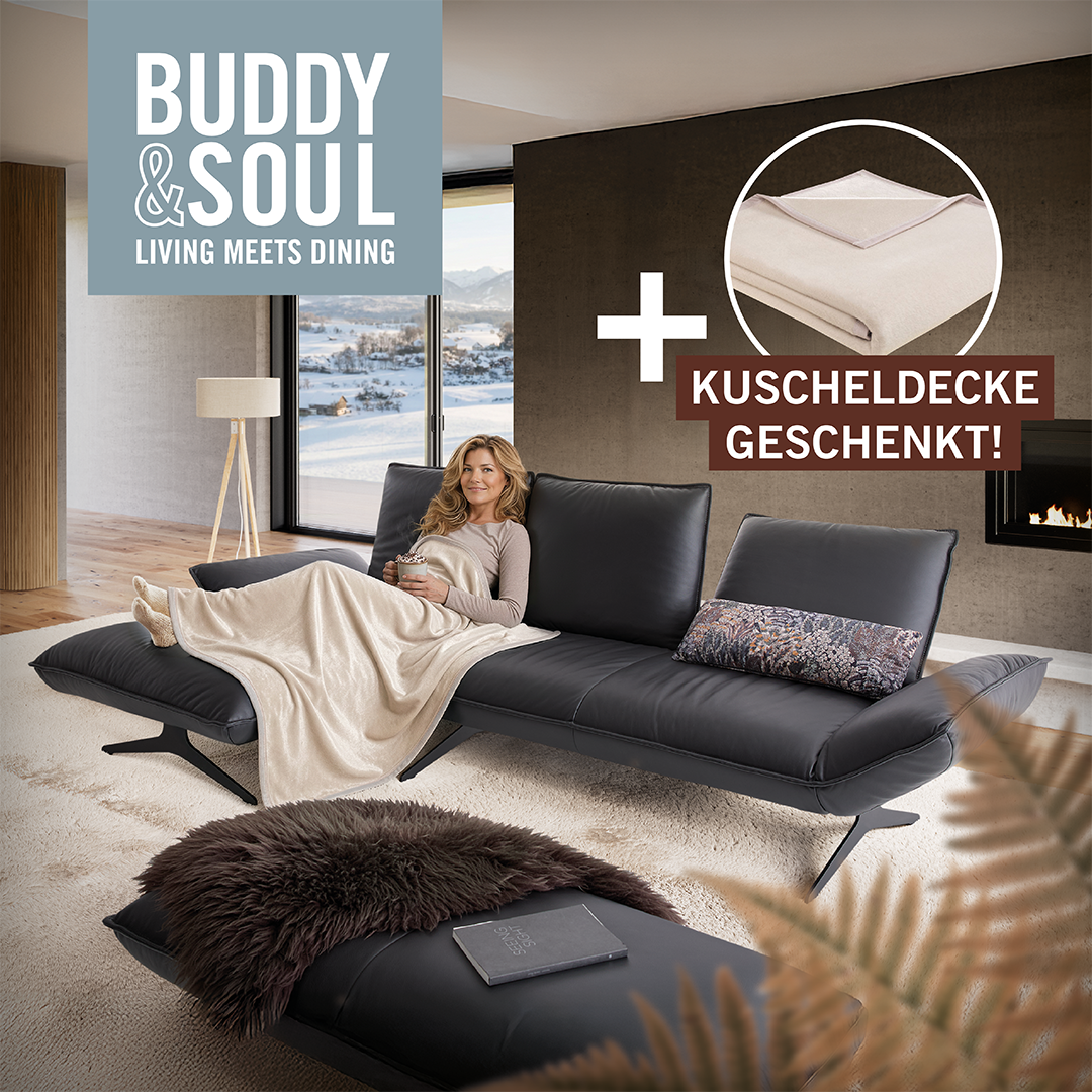 Beim Kauf eines Sofas (BUDDY) erhalten Sie im Kampagnenzeitraum von Januar bis März 2026 gratis eine KOINOR-Kuscheldecke. Bei Lieferung des Möbels liegt eine entsprechende Karte bei. Einfach über den QR Code aktivieren. Danach senden wir Ihnen das Präsent zu.